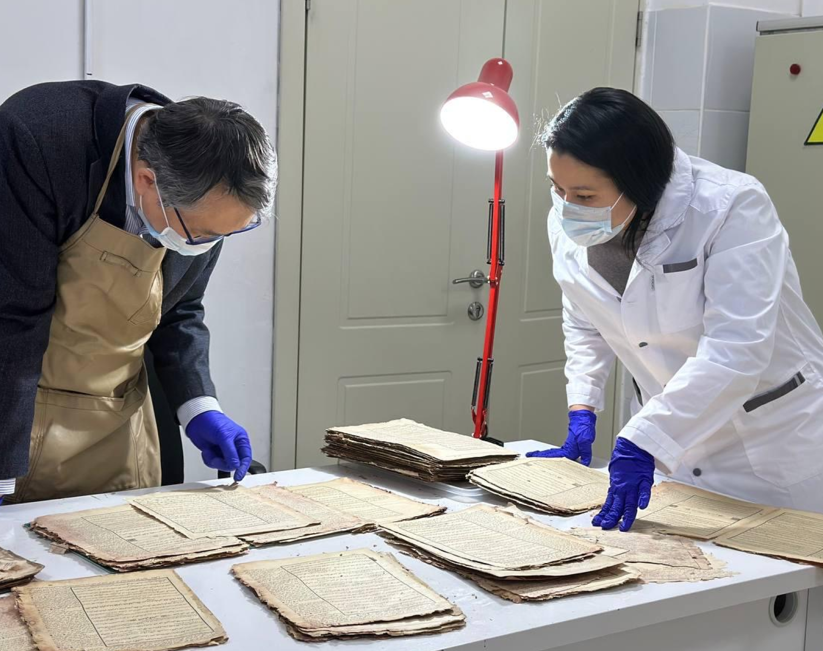 – Алғашқы кезеңі – кітап парақтарын қалпына келтіру, яғни «өсіру» жұмысы. Көне кітаптардың басым бөлігі жыртылған, кейбір тұстары мүлде жоғалған күйде келеді. Мұндай зақымданған бөліктер арнайы жапон қағазы мен қолдан қайнатылған ұн желімінің көмегімен қалпына келтіріледі. Жапон қағазының қалыңдығы мен тығыздығы әр кітап парағының ерекшелігіне қарай таңдалады. Бұл үдерісте қайтарымдылық қағидаты қатаң сақталады. Қолданылған материалдар кейін кітапқа зиян келтірмей қайта өңдеуге мүмкіндік беруі тиіс.
