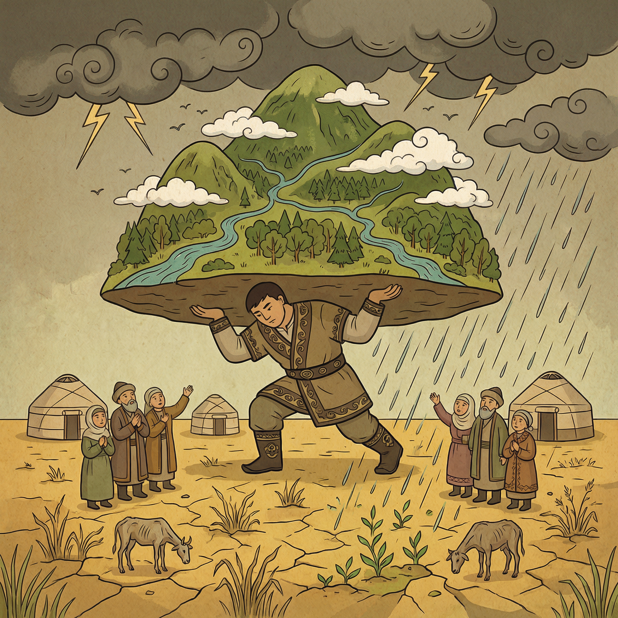 Бір жылы елге ауыр жұт келеді. Жаңбыр жаумай, жер қуаң тартады. Шөп қурап, мал қырыла бастайды. Адамдар да шөлден қиналады. Бір күні Толағай ыстықтан киіз үйді паналап отырған анасына қарап:
