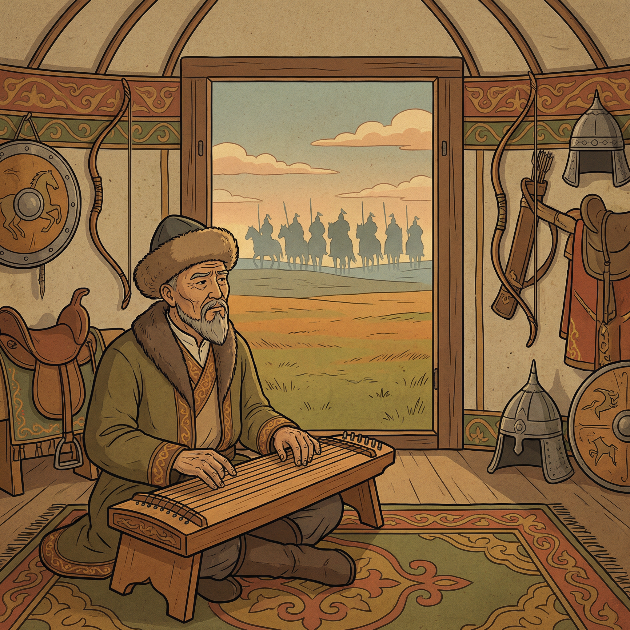 Күндердің бір күнінде күнінде алаөкпе болып жаушы жетіп, ел шетіне дұшпан әскерінің тұяқ іліктіргенін хабарлайды. Қарттың жеті ұлы мұздай сауыттарын киіп, жаудың алдын алуға аттанады.