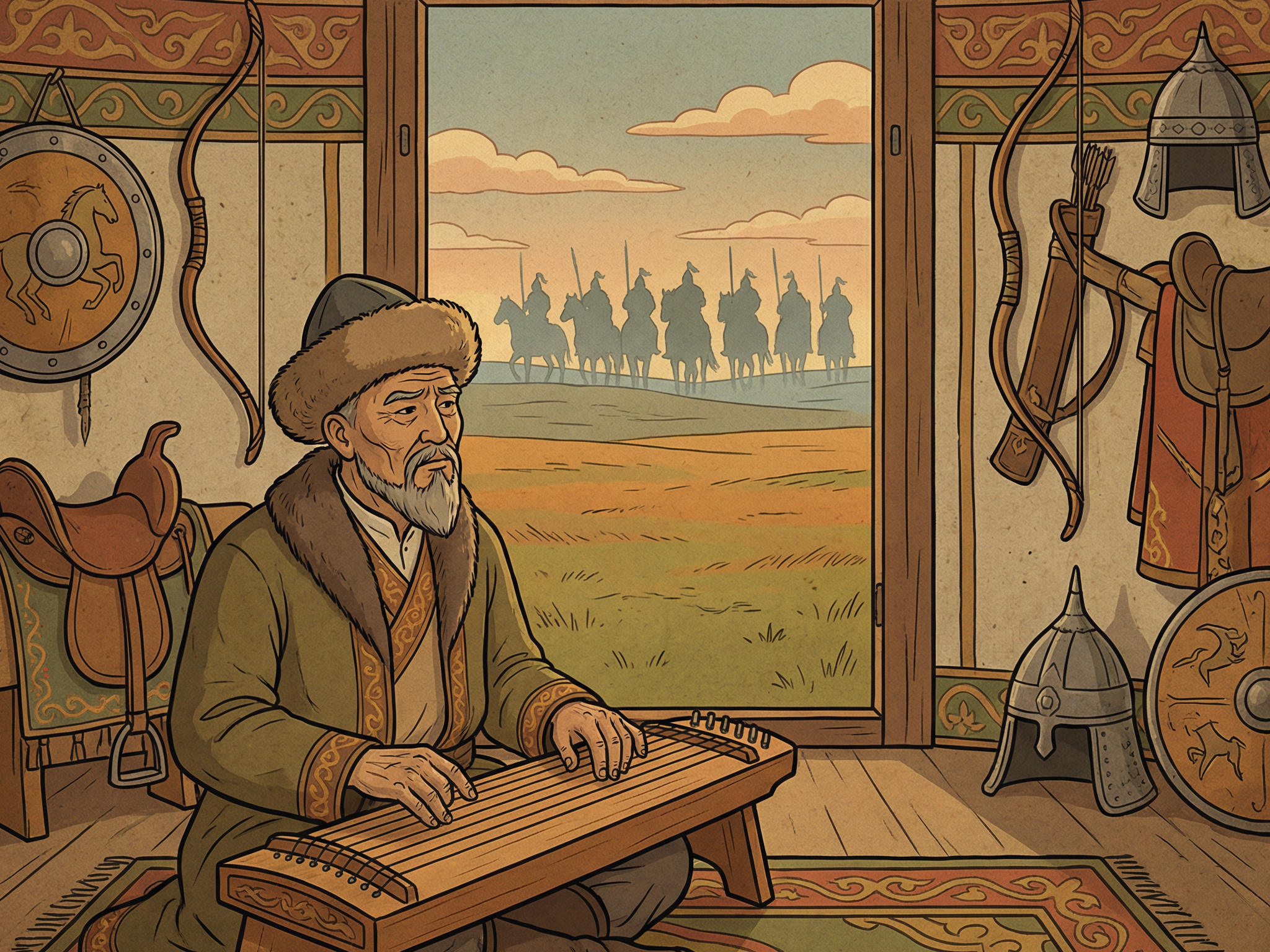Скорбная весть дошла до старого отца. Его горю, потерявшего сразу семерых сыновей, не было предела. Ничто не приносило ему утешения, душа его истлевала от тоски. Шли дни, проходили месяцы, но в памяти старца вновь и вновь оживали облик и нрав каждого из сыновей, и эта боль не давала ему покоя. Наконец, когда терпение его иссякло и сердце уже не могло выносить страдания, он однажды сделал музыкальный инструмент и в память о семерых сыновьях натянул на него семь струн.