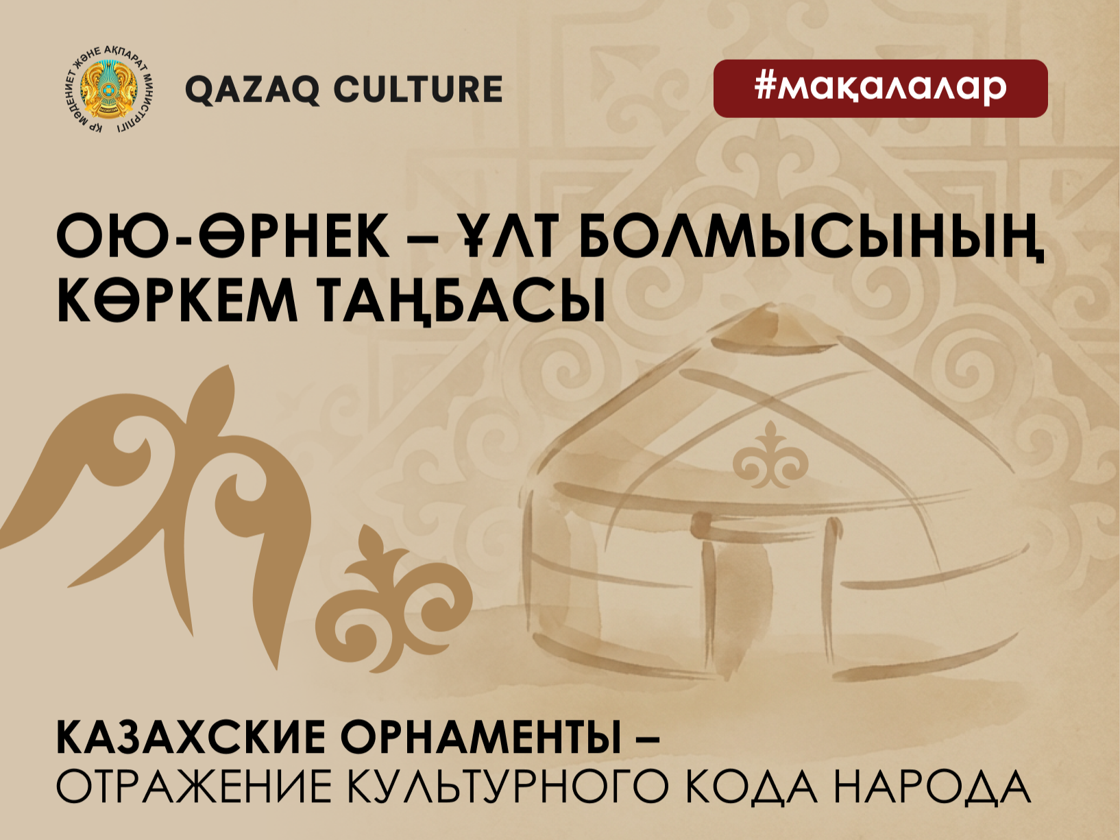Если внимательно присмотреться к казахскому орнаменту, можно увидеть не просто узор, а отражение души народа. Каждая линия и каждый изгиб – это голос, исходящий из глубины веков, несущий мудрость и утонченный эстетический вкус наших предков. Узоры, высеченные на камне, вышитые на войлоке или вплетенные в ткань шапана, стали своеобразным духовным кодом, сохранившим историю, характер и мировоззрение нашего народа. В этом коде есть все: уважение к природе, память о кочевой судьбе, представление о гармонии, понимание красоты как части повседневной жизни. Именно поэтому орнамент воспринимается не как декоративная деталь, а как культурный знак, через который можно прочитать прошлое.В казахской традиции «ою-өрнек» (орнамент)– это не только изображение и форма, но и особый язык символов. В нем отражается человеческое мышление и сам процесс познания: человек наблюдал окружающий мир, выделял главное и превращал увиденное в устойчивые художественные образы. Эволюция орнамента тесно связана с этническим и культурным развитием нашего народа. Племена, населявшие степи, изображая природные явления, животных и растения, формировали систему узоров, наполняя их глубоким смыслом. Со временем эти мотивы оттачивались, становились узнаваемыми и универсальными, а затем превратились в традиционное искусство национального стиля. Важно и то, что орнамент не существовал отдельно от жизни: он сопровождал человека с детства, присутствовал в доме, в одежде, в предметах быта, в украшениях и ритуальных мероприятиях, формируя целостное пространство культуры.Согласно археологическим исследованиям, первые элементы орнамента встречаются в культурном наследии саков, гуннов и тюркских племен VII-III веков до н. э. Эти узоры использовались для украшения предметов быта, одежды и вооружения. Орнамент в этом контексте был не только украшением, но и знаком принадлежности к миру степной цивилизации, в которой ценились сила, выносливость, защита рода и уважение к традиции. Для кочевника предметы, которые сопровождали его в дороге, были продолжением его идентичности, и потому художественное оформление имело особую значимость.В средние века, особенно в период Караханидов и Золотой Орды, орнаменты широко использовались в архитектуре. В украшении мавзолеев, мечетей и керамических изделий преобладали геометрические и растительные мотивы. Под влиянием исламской культуры содержание узоров приобрело духовное значение: усилилось стремление к гармонии форм, к ритму и симметрии, к декоративной “взвешенности”, где каждая деталь поддерживает целое. Архитектурный орнамент стал частью сакрального пространства и отражением представлений о порядке, красоте и духовности. При этом традиционные мотивы не исчезали, а переосмысливались и включались в новые художественные системы, что говорит о живучести орнаментальной культуры.В XIX-XX веках казахские узоры стали ключевым элементом декоративно-прикладного искусства. Орнамент особенно ярко проявлялся в войлочных изделиях, ткачестве, вышивке, резьбе, обработке металла и изготовлении украшений. Так, «қошқармүйіз» (бараний рог) украшал убранство юрты, «тұмарша» (амулет, талисман) применялся в женских украшениях, а «сынықмүйіз» (обломок, часть рога) часто встречался в ковровых изделиях. Каждый мотив отражал особенности опре